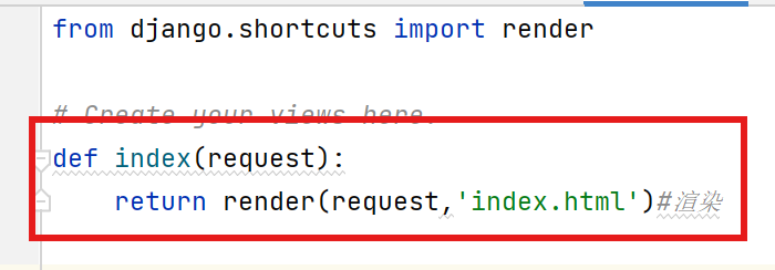 这个目的是当用户访问与这个视图关联的 URL时,Django 会执行这个 index 函数,它会找到 index.html 模板文件,将其内容转换为网页,并将网页发送给用户。