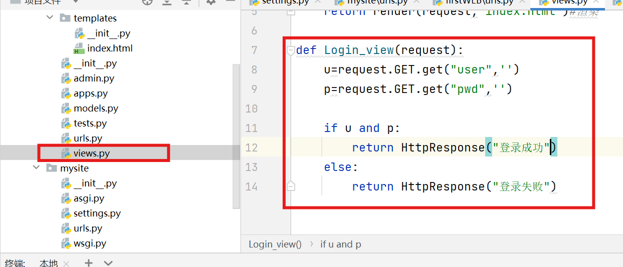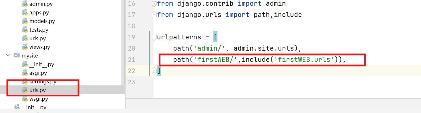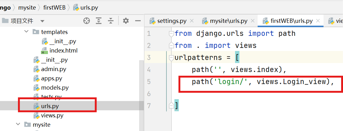 urls.py 文件的作用是告诉 Django,当用户访问某个特定的网址时,应该调用哪个 Python 函数(也就是视图函数)来处理这个请求。这里是建立一个映射关系,将网址http://127.0.0.1:8000/firstWEB/login/(本示例的地址) 和 views.py 文件里的 Login_view函数绑定在一起。