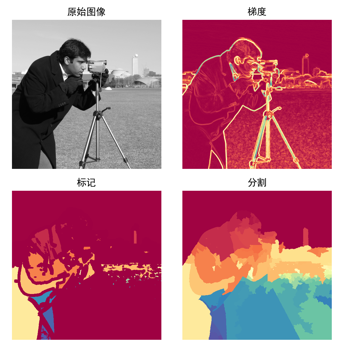 labels = segmentation.watershed(gradient, markers, mask=image)# 可视化结果