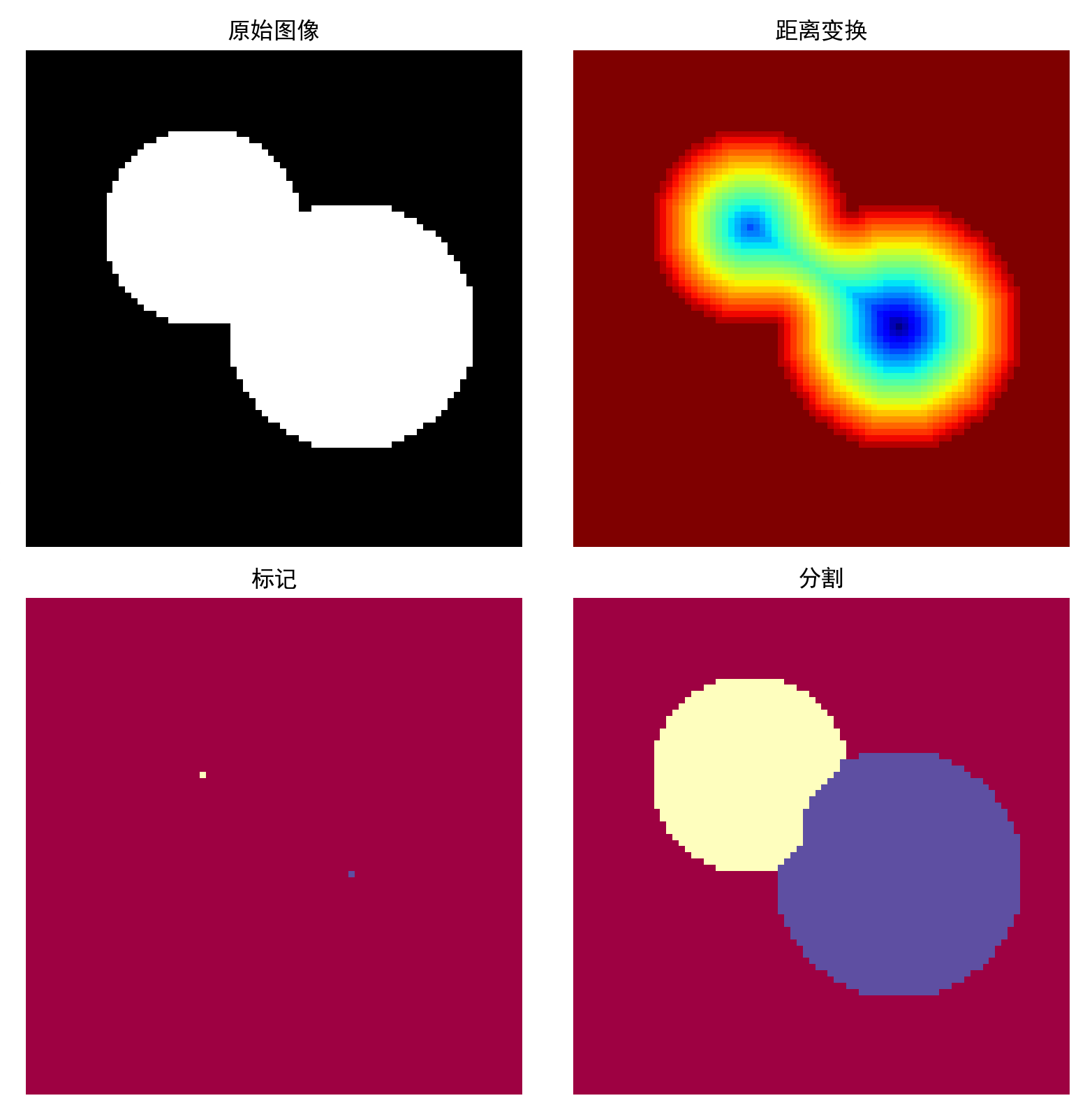 ax1.set_title("距离变换")ax2.imshow(markers, cmap=plt.cm.Spectral, interpolation='nearest')