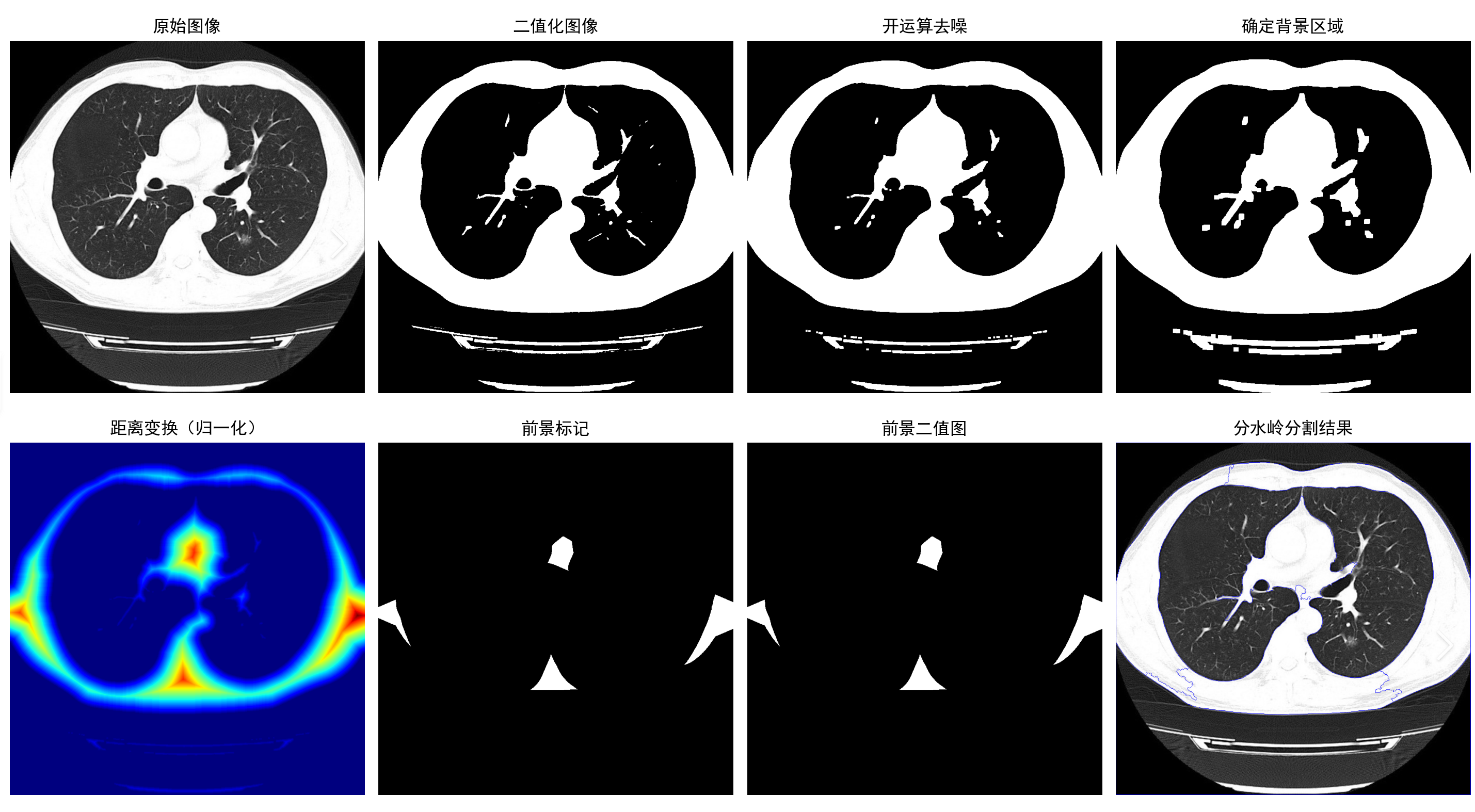 if __name__ == "__main__":# 1. 读取图像img_path = "37.jpg"img = cv.imread(img_path)# 2. 执行分水岭分割,获取所有显示结果display_results = watershed_demo(img)# 3. matplotlib 子图布局(2行4列,容纳8个结果图)plt.figure(figsize=(16, 8)) # 窗口大小:宽16英寸,高8英寸plt.rcParams['font.sans-serif'] = ['SimHei'] # 显示中文标题plt.rcParams['axes.unicode_minus'] = False # 解决负号显示异常# 4. 逐个绘制子图for idx, (title, img_data) in enumerate(display_results, 1):plt.subplot(2, 4, idx) # 2行4列,第idx个子图if len(img_data.shape) == 3: # 彩色图像(RGB格式)plt.imshow(img_data)else: # 灰度图像(二值图/距离变换图等)# 距离变换图用jet色表更直观,其他灰度图用gray色表cmap = 'jet' if "距离变换" in title else 'gray'plt.imshow(img_data, cmap=cmap)plt.title(title, fontsize=12) # 添加子图标题plt.axis('off') # 关闭坐标轴,聚焦图像# 5. 调整子图间距,避免标题/图像重叠plt.tight_layout()# 6. 显示所有子图(阻塞窗口,按关闭键退出)plt.show()