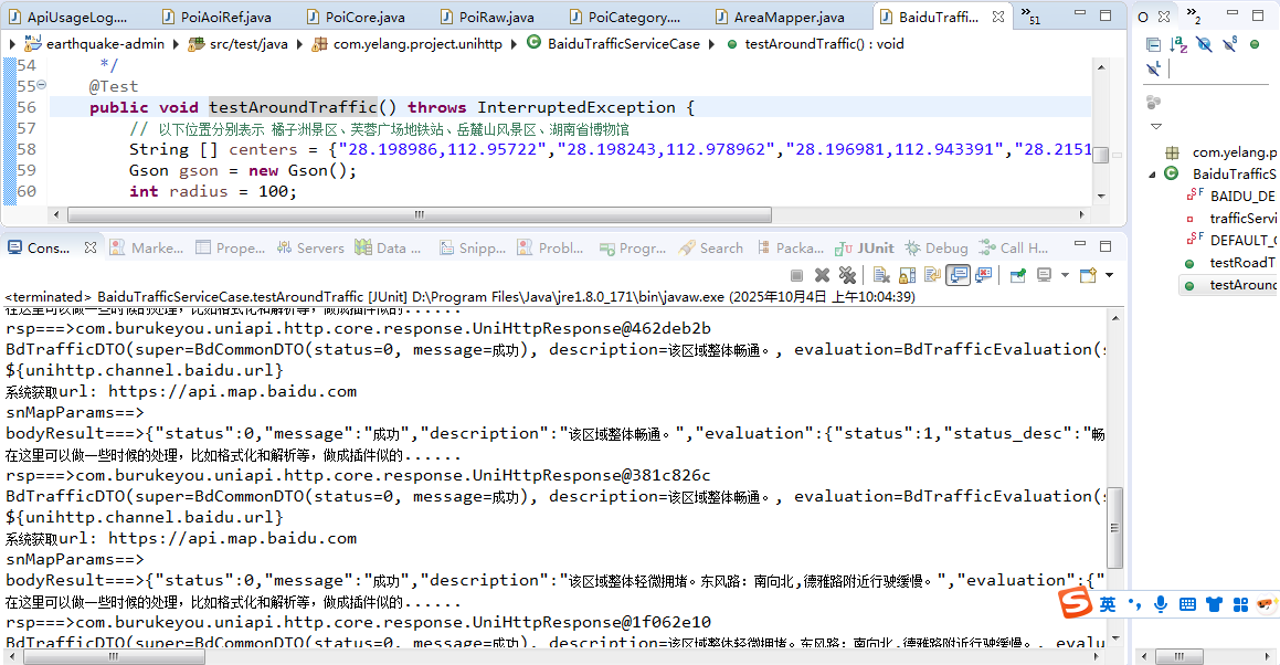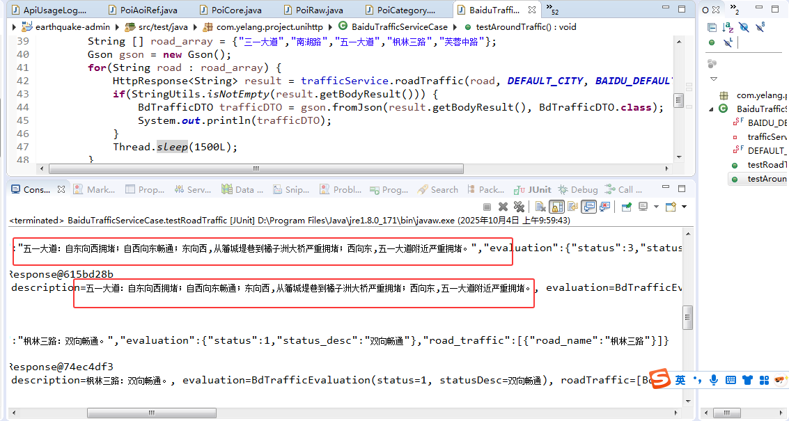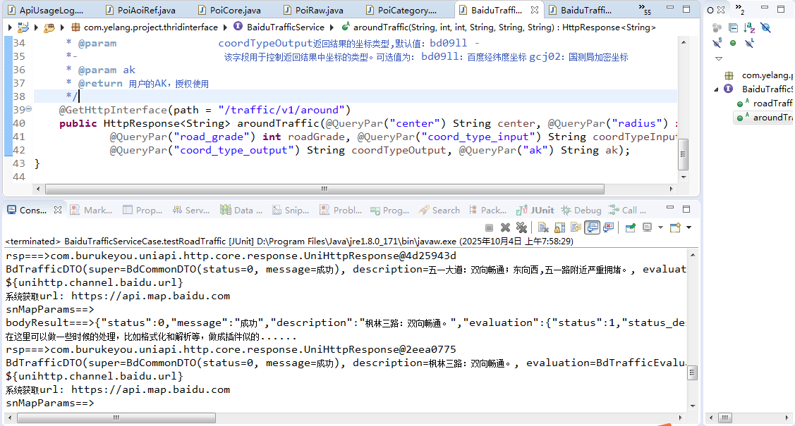 public class BaiduTrafficServiceCase {private static final String BAIDU_DEFAULT_AK = "yourak";@Autowiredprivate BaiduTrafficService trafficService;private static final String DEFAULT_CITY = "长沙市";/*** - 模拟根据道路名称查询拥堵情况* @throws InterruptedException*/@Testpublic void testRoadTraffic() throws InterruptedException {//模拟获取三一大道、五一大道、枫林三路、芙蓉中路的交通实况String [] road_array = {"三一大道","南湖路","五一大道","枫林三路","芙蓉中路"};Gson gson = new Gson();for(String road : road_array) {HttpResponse<String> result = trafficService.roadTraffic(road, DEFAULT_CITY, BAIDU_DEFAULT_AK);if(StringUtils.isNotEmpty(result.getBodyResult())) {BdTrafficDTO trafficDTO = gson.fromJson(result.getBodyResult(), BdTrafficDTO.class);System.out.println(trafficDTO);}Thread.sleep(1500L);}}
