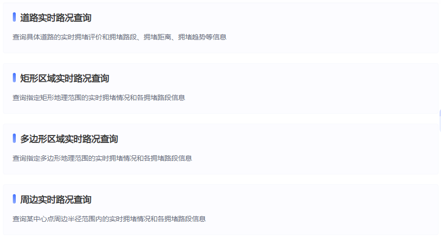 以上是百度地图实时路况的服务列表,下面将详细介绍道路实时路况服务和周边实时路况服务两个接口。