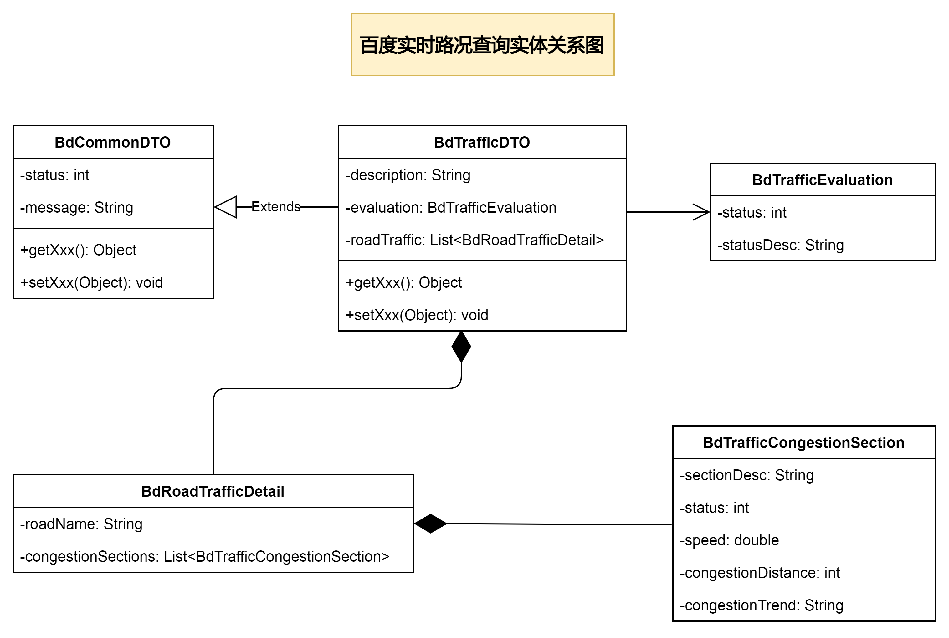 public class BdTrafficDTO extends BdCommonDTO implements Serializable{private static final long serialVersionUID = -5247239994807521257L;private String description;//路况语义化描述,如:'东四北大街:双向行驶缓慢;南向北,北新桥地铁站附近严重拥堵。'private BdTrafficEvaluation evaluation;//路况整体评估对象@SerializedName("road_traffic")private List<BdRoadTrafficDetail> roadTraffic;//路况详细信息