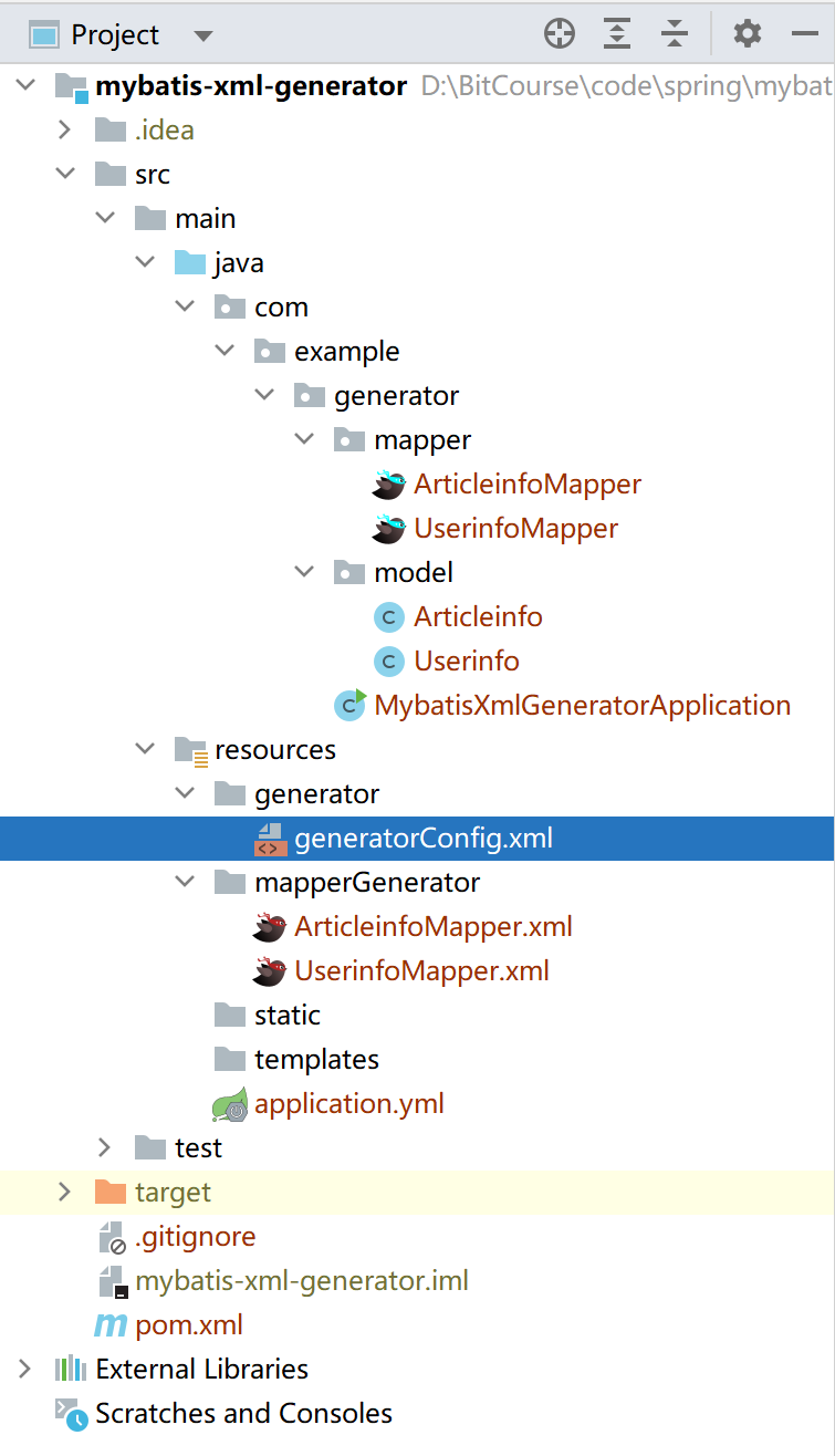 <generatorConfiguration><!-- 一个数据库一个context --><context id="MysqlTables" targetRuntime="MyBatis3Simple" defaultModelType="flat"><!--去除注释--><commentGenerator><property name="suppressDate" value="true"/><property name="suppressAllComments" value="true" /></commentGenerator><!--数据库链接信息--><jdbcConnection driverClass="com.mysql.jdbc.Driver"connectionURL="jdbc:mysql://127.0.0.1:3308/mybatis_test?serverTimezone=Asia/Shanghai&nullCatalogMeansCurrent=true"userId="root"password="123456"></jdbcConnection><!-- 生成实体类 --><javaModelGenerator targetPackage="com.example.generator.model" targetProject="src/main/java" ><property name="enableSubPackages" value="false"/><property name="trimStrings" value="true"/></javaModelGenerator><!-- 生成 mapper xml文件 --><sqlMapGenerator targetPackage="mapperGenerator" targetProject="src/main/resources" ><property name="enableSubPackages" value="false" /></sqlMapGenerator><!-- 生成mapxml对应client,也就是接口dao --><javaClientGenerator targetPackage="com.example.generator.mapper" targetProject="src/main/java" type="XMLMAPPER" ><property name="enableSubPackages" value="false" /></javaClientGenerator><!-- table可以有多个,每个数据库中的表都可以写一个table,tableName表示要匹配的数据库表,也可以在tableName属性中通过使用%通配符来匹配所有数据库表,只有匹配的表才会自动生成文件 --><table tableName="userinfo"><property name="useActualColumnNames" value="false" /><!-- 数据库表主键 --><generatedKey column="id" sqlStatement="Mysql" identity="true" /></table><table tableName="articleinfo"><property name="useActualColumnNames" value="false" /><!-- 数据库表主键 --><generatedKey column="id" sqlStatement="Mysql" identity="true" /></table></context>