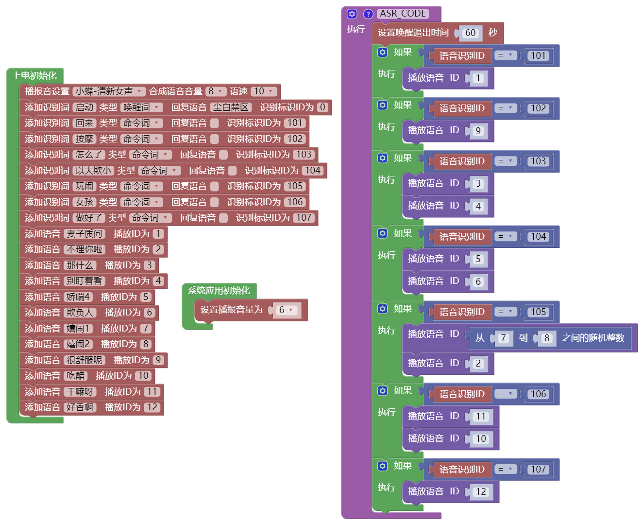 我们先看左边的上电初始化,开头有一个播报音设置,官方提供了很多声音供我们使用,在这个模块还可以修改声音的语速和音量,但是如果我们把全部语音替换掉的话,其实也没什么用,不用管它。