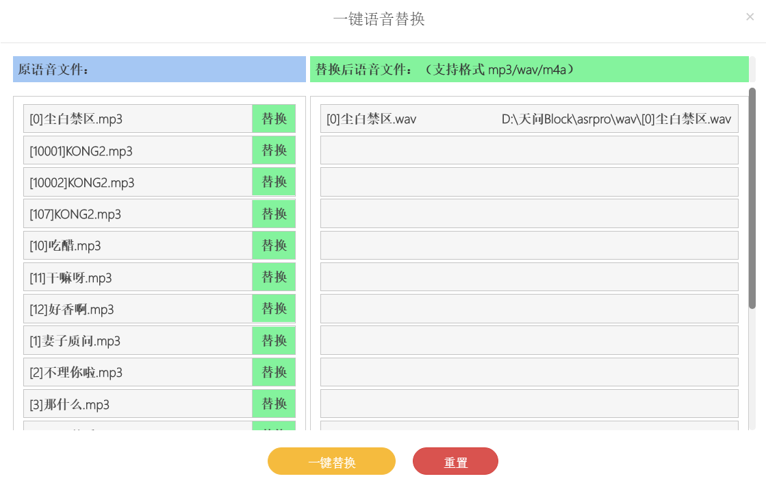 首先,我们需要点击生成模型,生成所有语音,之后在 更多->一键替换语音 处打开如下图界面。