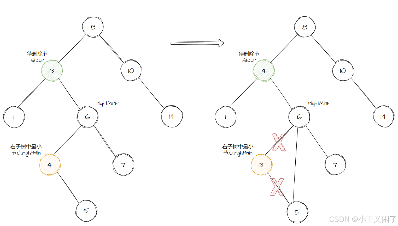 小Tips:删除节点有两个孩子时,我们要先找到右子树的最小节点 rightMin ,同时也要记录 rightMinP ,从 cur 的右子树向左一直找即可。找到后交换 cur 和 rightMin 的值,这时我们就将问题转换为删除 rightMin 节点。