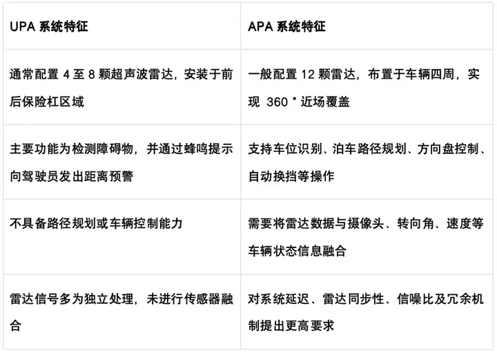超声波雷达最初在汽车上主要应用为UPA(Ultrasonic Parking Assist),也就是我们平时听懂“嘟嘟”声音的倒车雷达。现在,则发展到了更高级的APA(Automated Parking Assist)的发展阶段。二者虽然在雷达结构上具有一定相似性,但在系统架构、功能逻辑、传感融合和智能控制等方面存在本质差异。