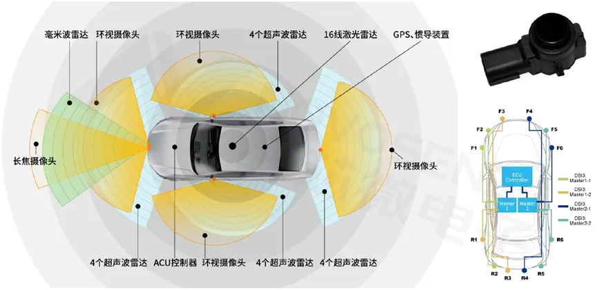 在APA中,超声波雷达通常采用“探头(Slave)-主芯片(Master)-域控(ECU/VCU)”的三级架构:底层的Slave探头负责发射超声波并接收回波,通过主线连接至中层的Master芯片(一个Master芯片支持6个Slave探头,12个需要配备两个Master芯片),最终两颗Master芯片再连接到域控。