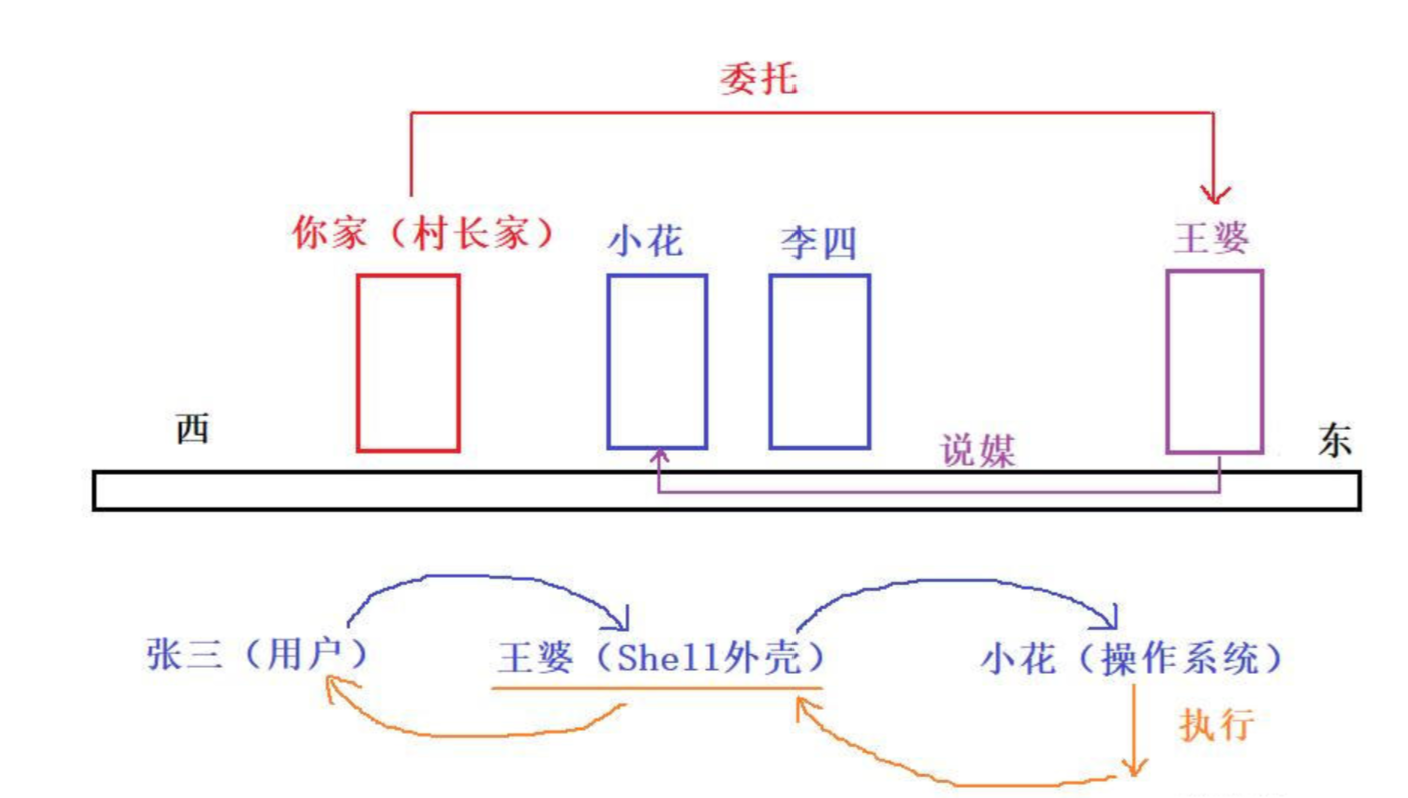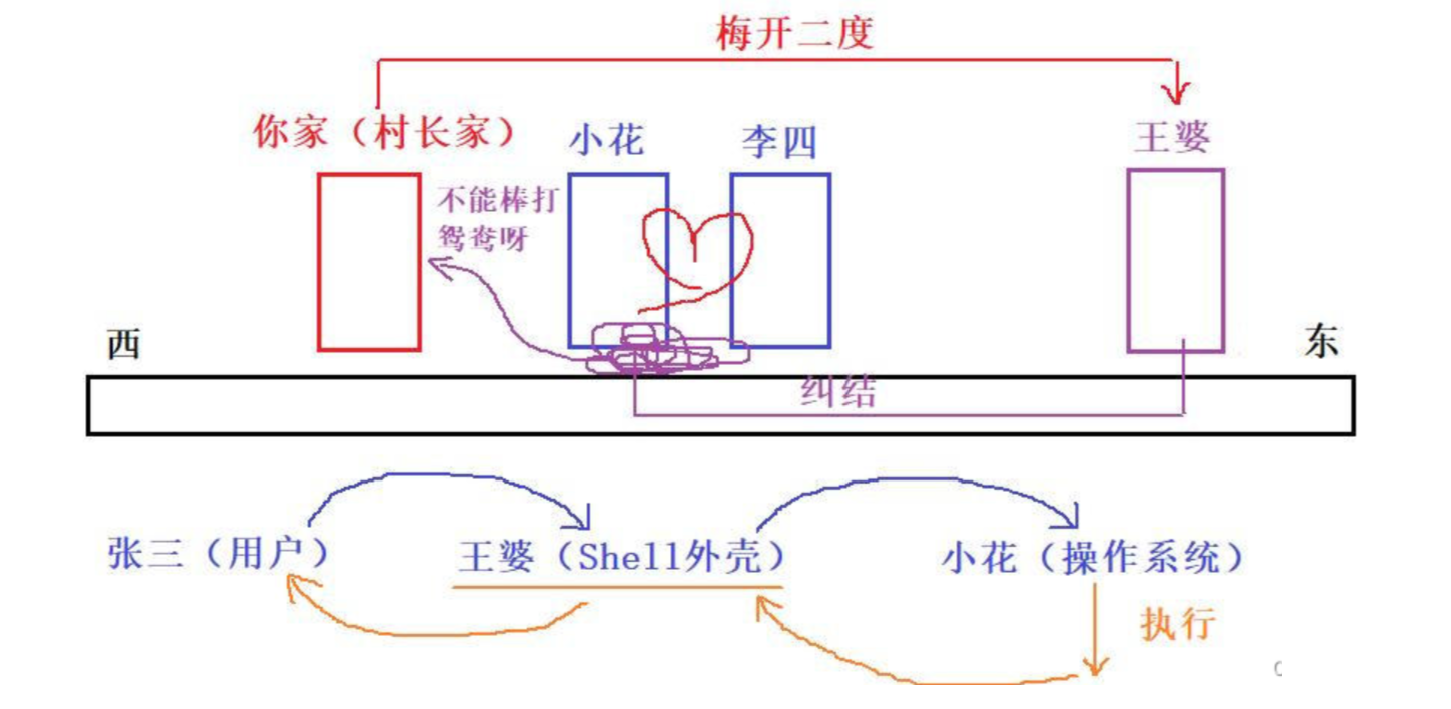 - 命令传递与结果返回(对应故事①):在故事里,张三(用户)有追求小花(操作系统)的需求,无法直接与小花沟通,需通过父亲转达给王婆,王婆再将 “张三想和小花处处” 的诉求(用户命令)传递给小花;小花的态度(操作系统执行命令后的结果)也由王婆带回给张三父子,这就如同 Shell 在用户和操作系统之间的作用 —— 接收用户的命令,传递给操作系统内核,再将操作系统执行命令的结果反馈给用户。