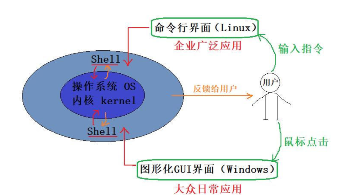🎯通过上面的小案例,我们可以去理解Shell外壳的工作原理,这里可以将张三也就是你看做是用户,然后将小花呢看做是操作系统,平常我们来使用操作系统的时候,其实并不是直接对操作系统的内核进行处理,而是通过鼠标的点击进行一些对应的访问,此时呢你和操作系统之间就存在着一个交互的东西叫做Shell,Shell可以作为你和操作系统之间的一个传递者,通过Shell让操作系统知道你的想法,然后操作系统执行你的命令,再通过Shell返回出去,所以可以看出这个王婆也就是Shell,起到一个中介的作用