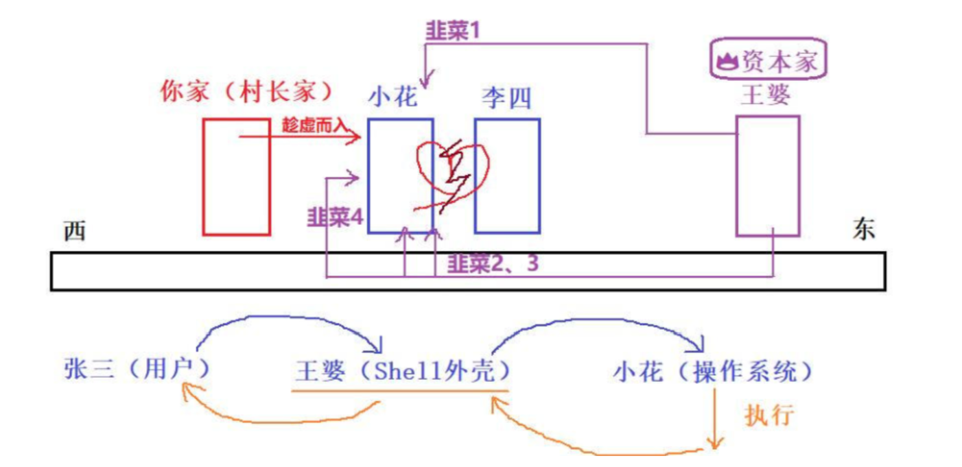 - 保护操作系统(对应故事①):当王婆看到小花和李四已有稳定关系(操作系统处于特定 “工作状态” 或 “占用状态”),意识到再去劝说会打扰小花,便放弃说媒,这类似 Shell 对操作系统的保护功能。Shell 会判断用户命令是否合适,避免不合适的命令干扰操作系统正常运行,就像王婆不打扰已有固定伴侣的小花一样,防止用户直接操作内核可能带来的混乱。