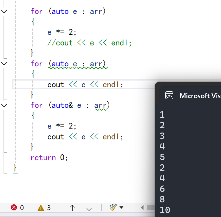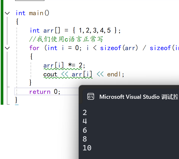 可以看到我们for循环里面要写很多东西。而c++就方便了很多。就是有一个点要注意:e要取地址要不然就无法改变数组的值。