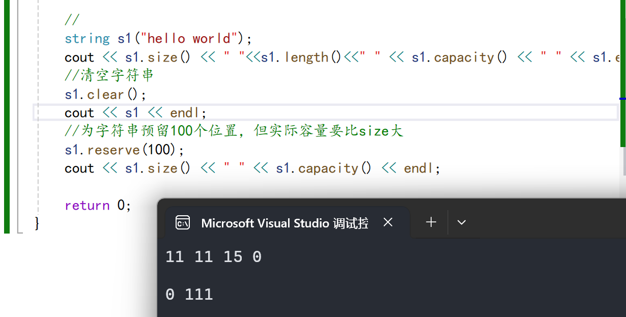 注意:1. size()与length()方法底层实现原理完全相同,引入size()的原因是为了与其他容器的接口保持一致,一般情况下基本都是用size()。2. clear()只是将string中有效字符清空,不改变底层空间大小。3. resize(size_t n) 与 resize(size_t n, char c)都是将字符串中有效字符个数改变到n个,不同的是当字符个数增多时:resize(n)用0来填充多出的元素空间,resize(size_t n, charc)用字符c来填充多出的元素空间。注意:resize在改变元素个数时,如果是将元素个数增多,可能会改变底层容量的大小,如果是将元素个数减少,底层空间总大小不变。4. reserve(size_t res_arg=0):为string预留空间,不改变有效元素个数,当reserve的参数小于string的底层空间总大小时,reserver不会改变容量大小。