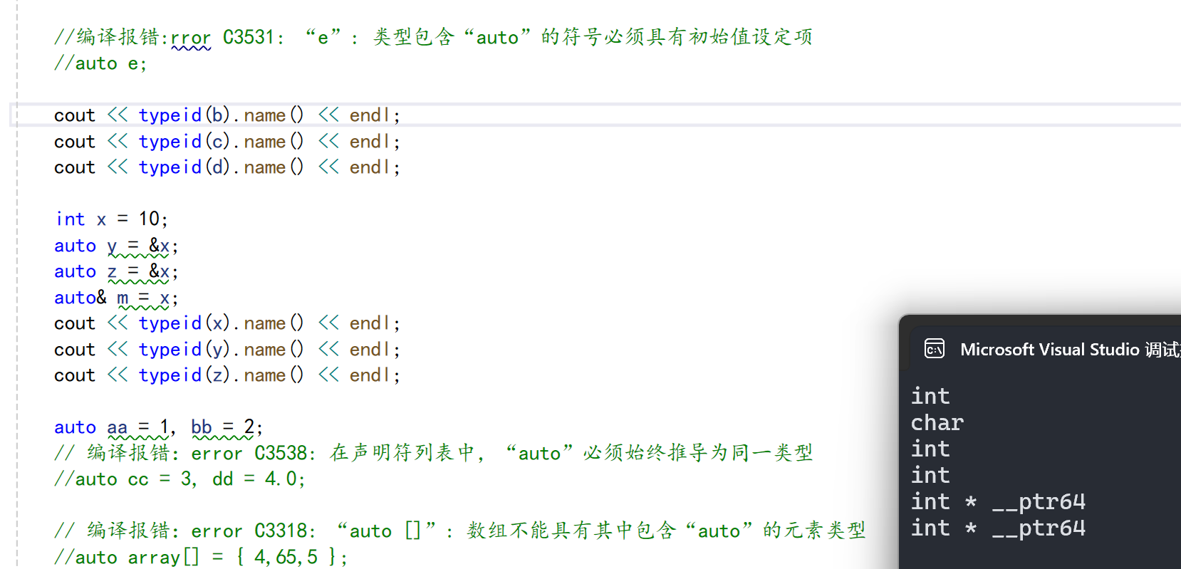在早期C/C++中auto的含义是:使用auto修饰的变量,是具有自动存储器的局部变量,后来这个不重要了。C++11中,标准委员会变废为宝赋予了auto全新的含义即:auto不再是一个存储类型指示符,而是作为一个新的类型指示符来指示编译器,auto声明的变量必须由编译器在编译时期推导而得。用auto声明指针类型时,用auto和auto*没有任何区别,但用auto声明引用类型时则必须加&当在同一行声明多个变量时,这些变量必须是相同的类型,否则编译器将会报错,因为编译器实际只对第一个类型进行推导,然后用推导出来的类型定义其他变量。auto不能作为函数的参数,可以做返回值,但是建议谨慎使用auto不能直接用来声明数组