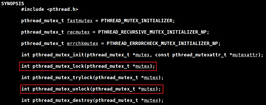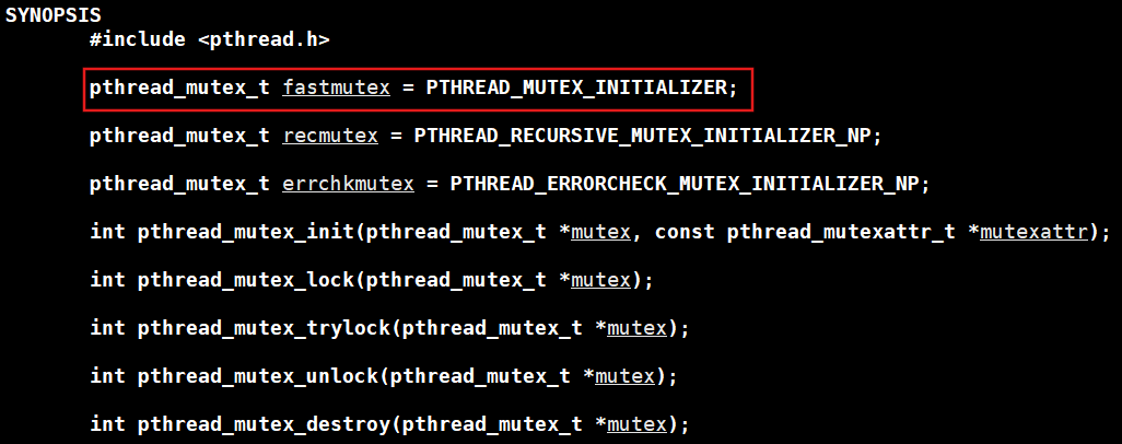 pthread_mutex_t lock = PTHREAD_MUTEX_INITIALIZER; // 定义一把锁并初始化