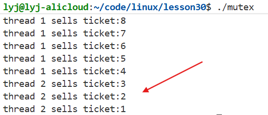 {char *id = (char *)arg;while (1){pthread_mutex_lock(&lock); // 加锁if (ticket > 0) // 判断票的数量{usleep(1000); // 模拟抢票的时候花费的时间printf("%s sells ticket:%d\n", id, ticket); // 假设这里就是抢到票了ticket--; // 更新票的数量pthread_mutex_unlock(&lock); // 解锁}else{pthread_mutex_unlock(&lock); // 防止走到else时锁没解break;}}return nullptr;