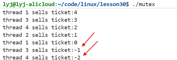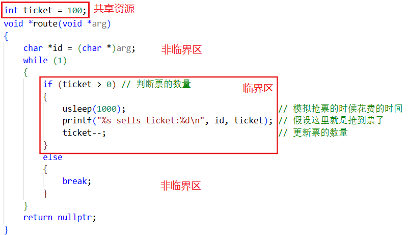 {char *id = (char *)arg;while (1){if (ticket > 0) // 判断票的数量{usleep(1000); // 模拟抢票的时候花费的时间printf("%s sells ticket:%d\n", id, ticket); // 假设这里就是抢到票了ticket--; // 更新票的数量}else{break;}}return nullptr;