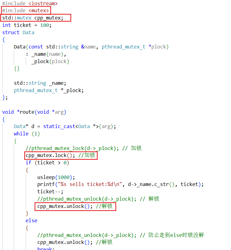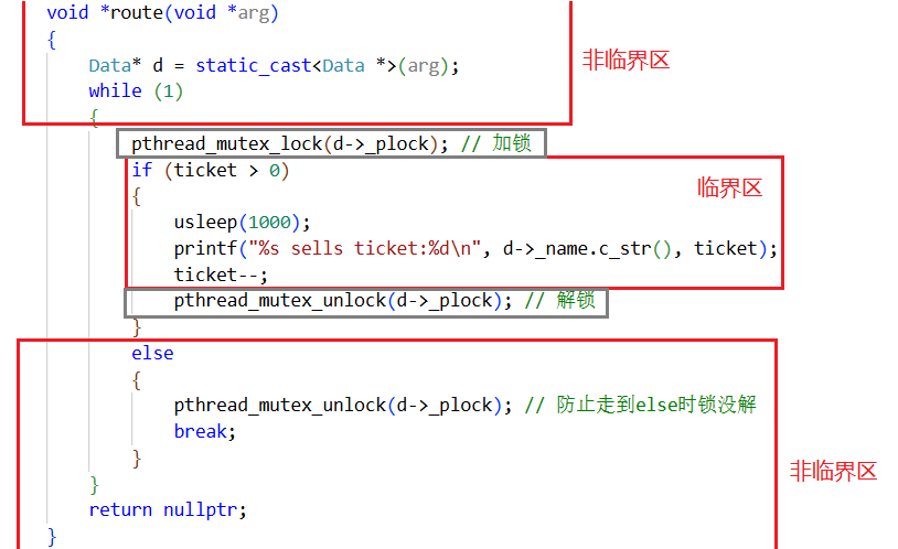 {Data* d = static_cast<Data *>(arg);while (1){pthread_mutex_lock(d->_plock); // 加锁if (ticket > 0){usleep(1000);printf("%s sells ticket:%d\n", d->_name.c_str(), ticket);ticket--;pthread_mutex_unlock(d->_plock); // 解锁}else{pthread_mutex_unlock(d->_plock); // 防止走到else时锁没解break;}}return nullptr;