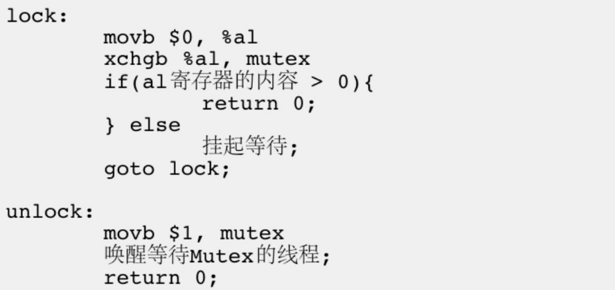 软件实现:为了实现互斥锁操作,⼤多数体系结构都提供了swap或exchange汇编指令,该指令的作⽤是把寄存器和内存单元的数据相交换,由于只有⼀条指令,保证了原⼦性,下面有段伪代码。