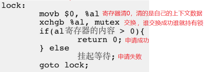 当后面来的执行流想申请锁,首先会把寄存器清0,然后在交换的这一步时,就只会用0换0,因为这个1已经被之前的线程申请走了,此时申请锁失败,线程就会阻塞挂起。