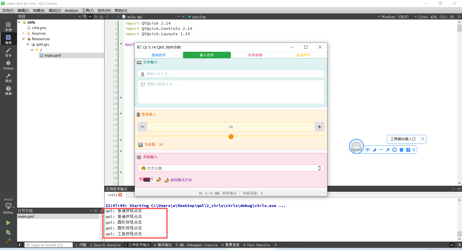 控件组合的效果,按下基础控件中的按钮,应用程序输出将会打印事件。