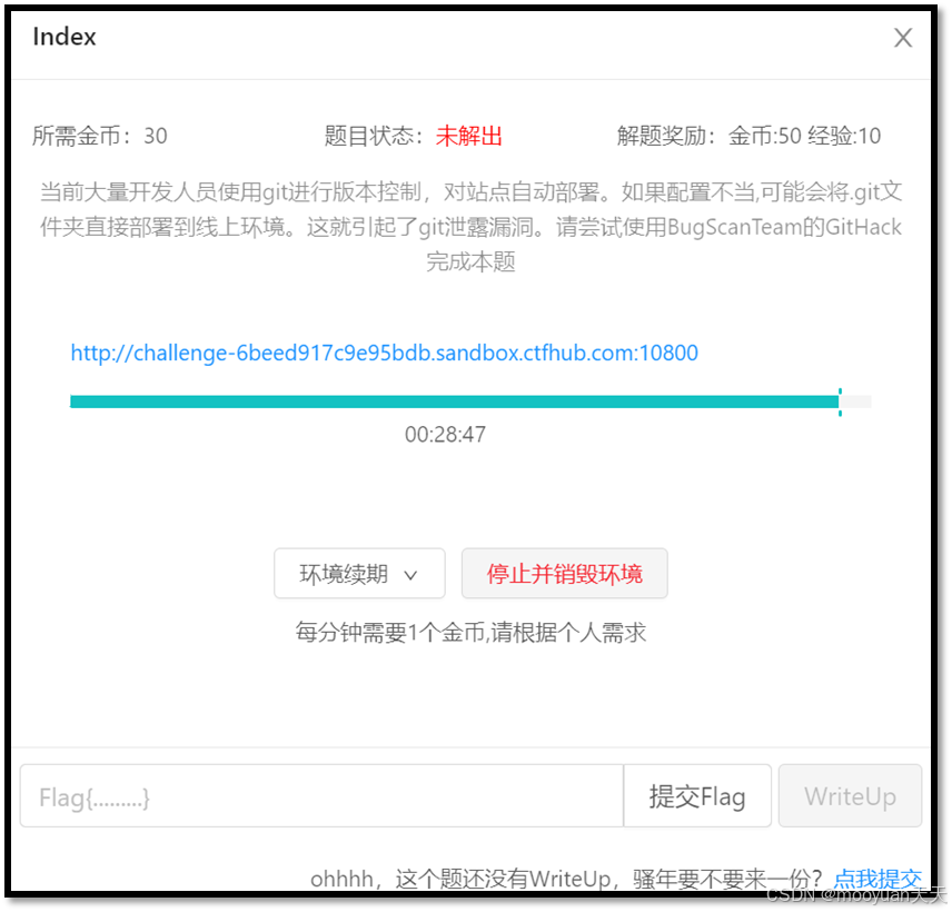 打开关卡如下所示,提示信息为“当前大量开发人员使用git进行版本控制,对站点自动部署。如果配置不当,可能会将.git文件夹直接部署到线上环境。这就引起了git泄露。请尝试使用BugScanTeam的GitHack完成本题”,提示本关卡可以利用.git泄露进行渗透测试。点击打开题目,此时系统自动创建Docker环境,下图蓝色部分的URL地址就是靶场环境。