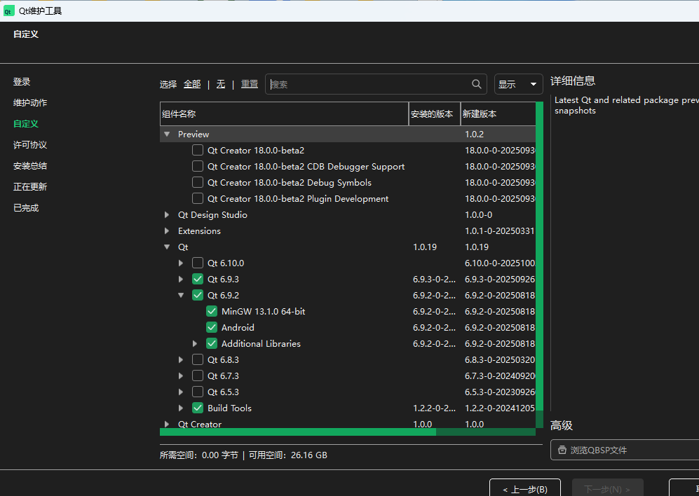 运行完程序之后,会自动弹出QT支持包,选择一个版本功能中有”Serial Port“功能的进行安装(比如我6.9.2不支持串口,但是6.9.3可以),然后再到左侧框”项目“选项中把6.9.3相关的全部运行,6.9.2的给关掉