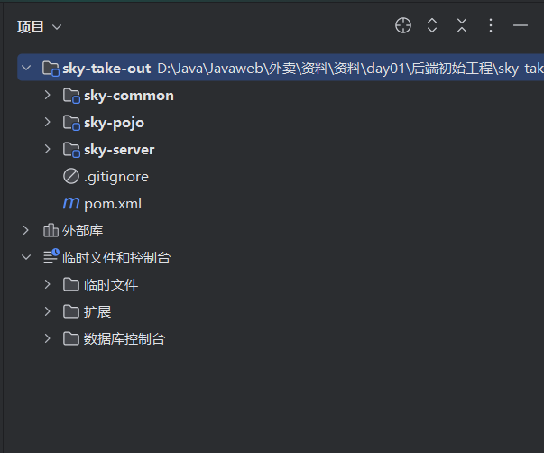 其中父工程是sky-take-out,三个子模块在pom.xml配置了parent属性。