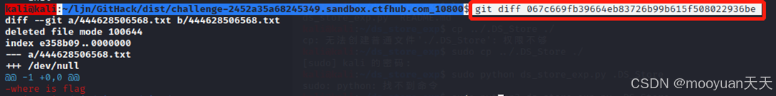 执行git log diff,比较add flag版本的代码修改日志,如下所示成功获取到flag。