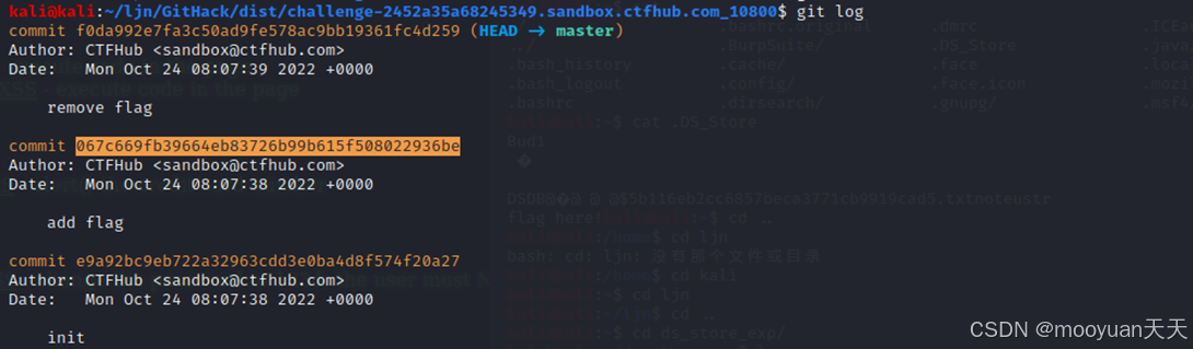 进入到git目录,执行git log发现add flag,记录下git log id,如下所示。