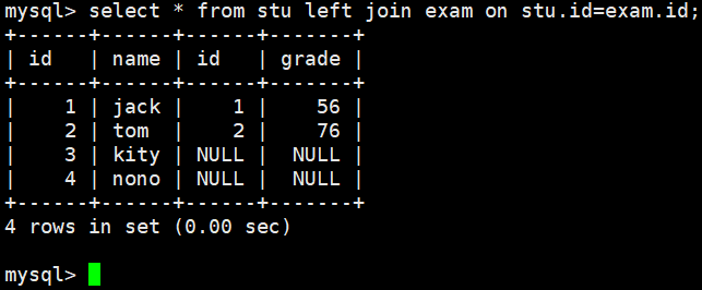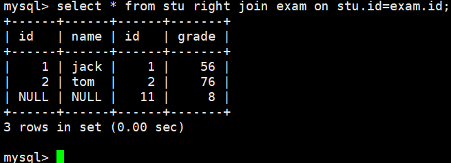 对stu表和exam表联合查询,把所有的成绩都显示出来,即使这个成绩没有学生与它对应,也要 显示出来