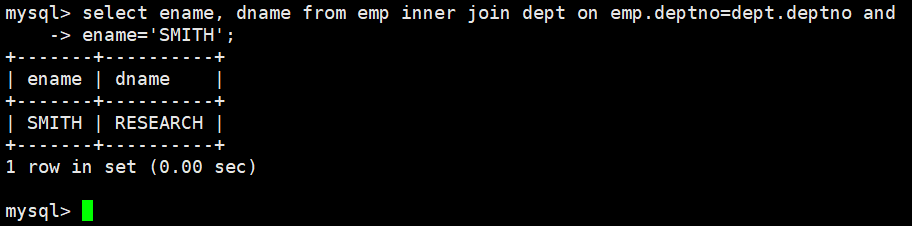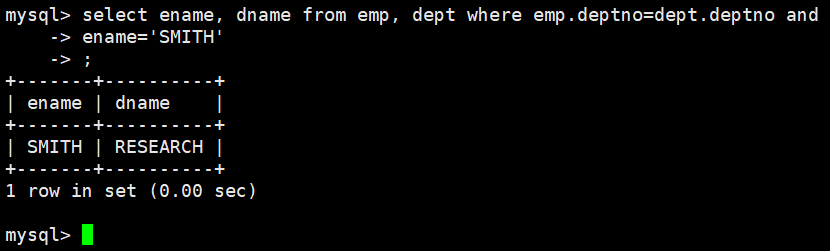 显示SMITH的名字和部门名称(下图为员工,部门,薪资表具体表内容可以查看mysql前面几篇博客)