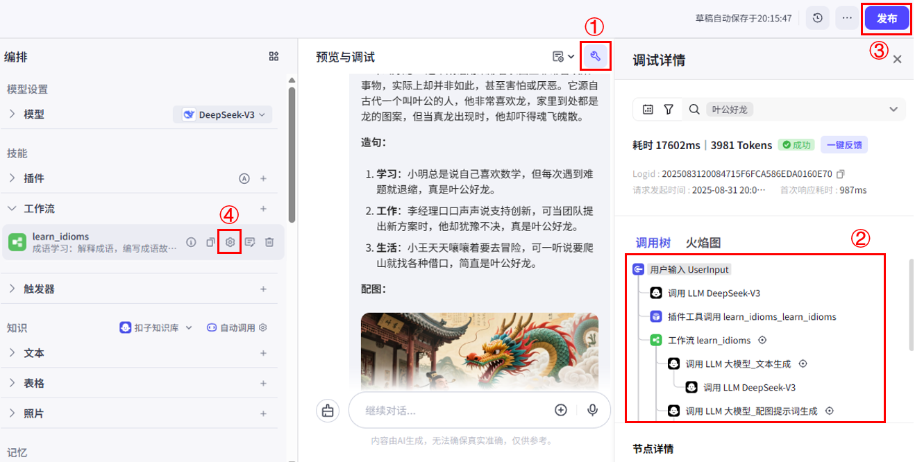(1)如图12-22所示,在“预览与调试" 区域的对话框中输入成语“叶公好龙”,可以测试智能体的效果。智能体调用工作流“learn_idioms”进行处理,输出内容包括成语解释、成语造句和配图。单击“图片链接”,可以查看生成的图片。