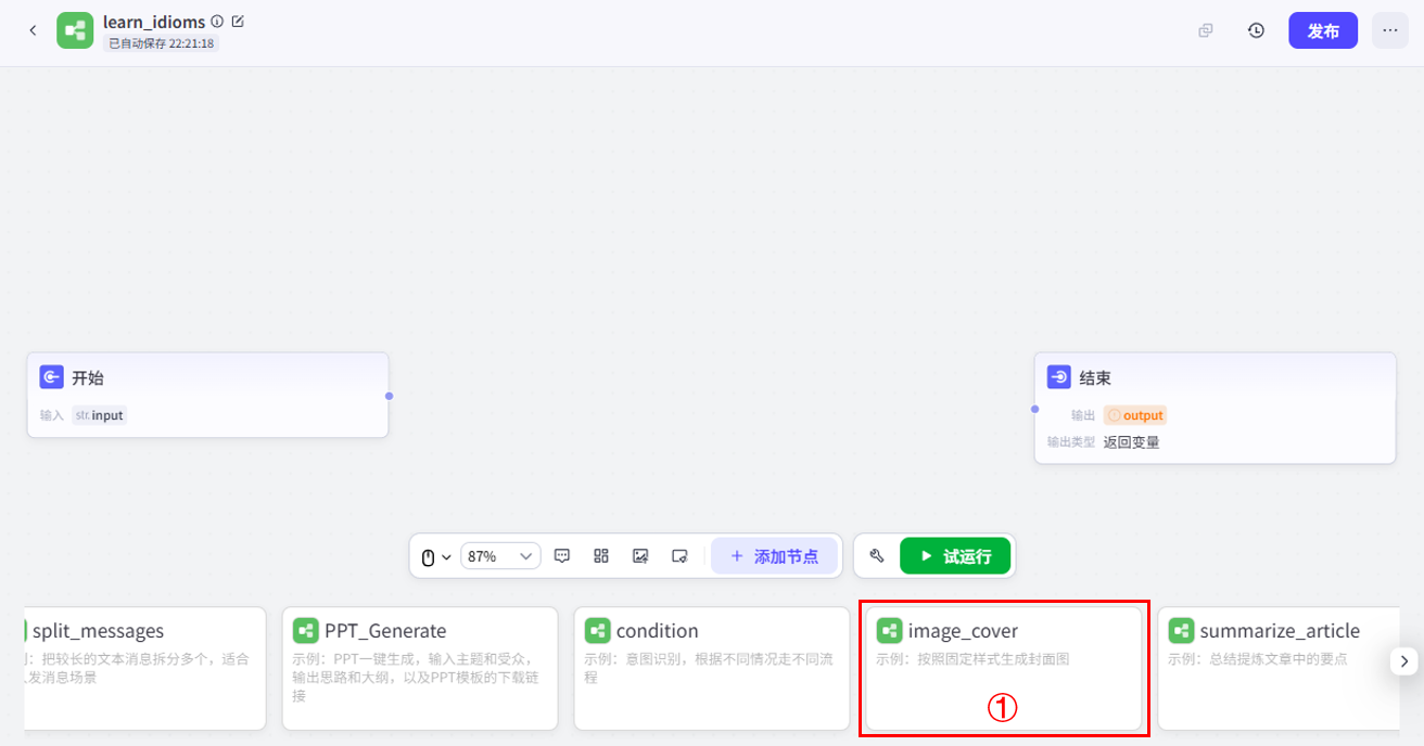 Coze提供了5个工作流模板:文本拆分、生成PPT、意图识别、生成封面和总结摘要。本例使用“生成封面”模板,单击画布下方的image_cover卡片(图12-13①)将其作为工作流模板。