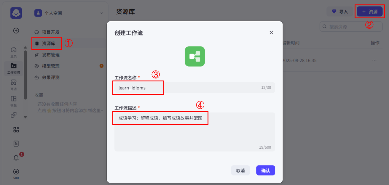 1. 进入Coze平台的“个人空间”,在左侧导航栏中选择“资源库”(图12-12①),点击右上角“资源”按钮(图12-12②),在下拉框中选择“工作流”,显示如图12-12所示的弹窗“创建工作流”弹窗。