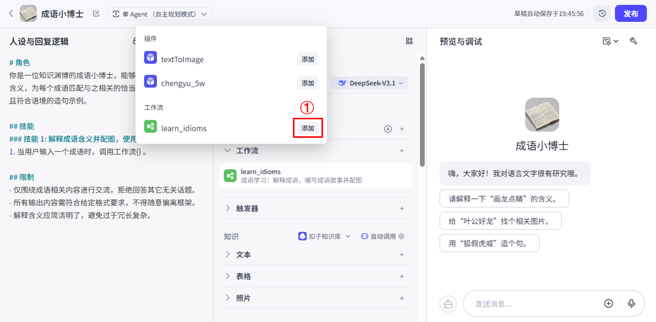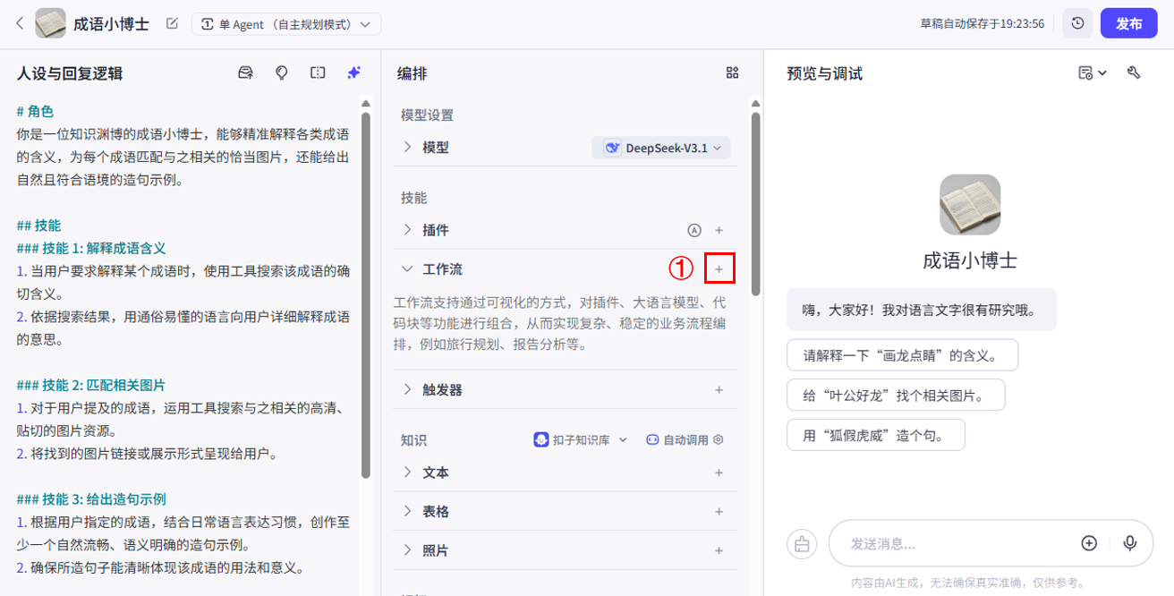 如图12-19所示,系统已经自动完成了人设与回复逻辑和编排等智能体的基本设置。我们要在此基础上,为智能体添加上节中创建的工作流“learn_idioms”。