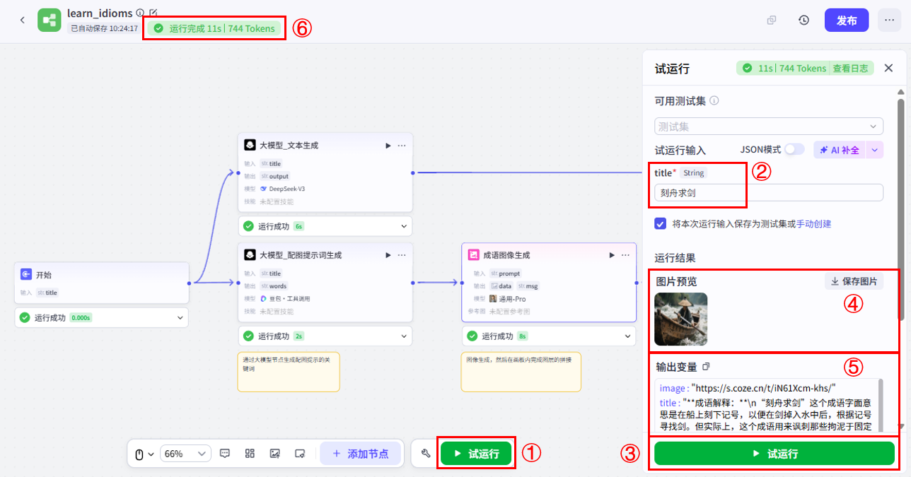 (4)运行成功的节点下方会出现“运行成功”显示条,点击后可查看节点的输入和输出。工作流全部运行完成后,在工作流图标后面会出现“运行成功”显示条(图12-18⑥)。