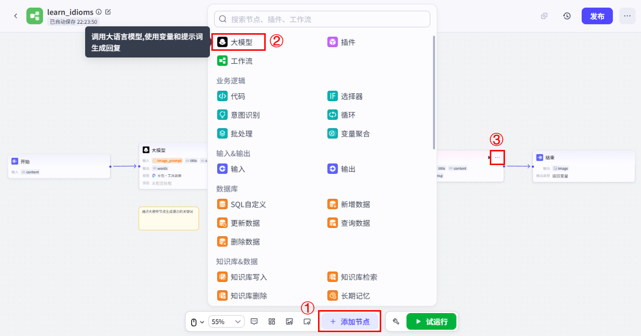 如图12-14所示,要添加一个大模型节点用于文本生成,只需单击选中“大模型”选项(图12-14②)即可完成节点添加。类似地,可以依次添加其它需要的工作流节点。