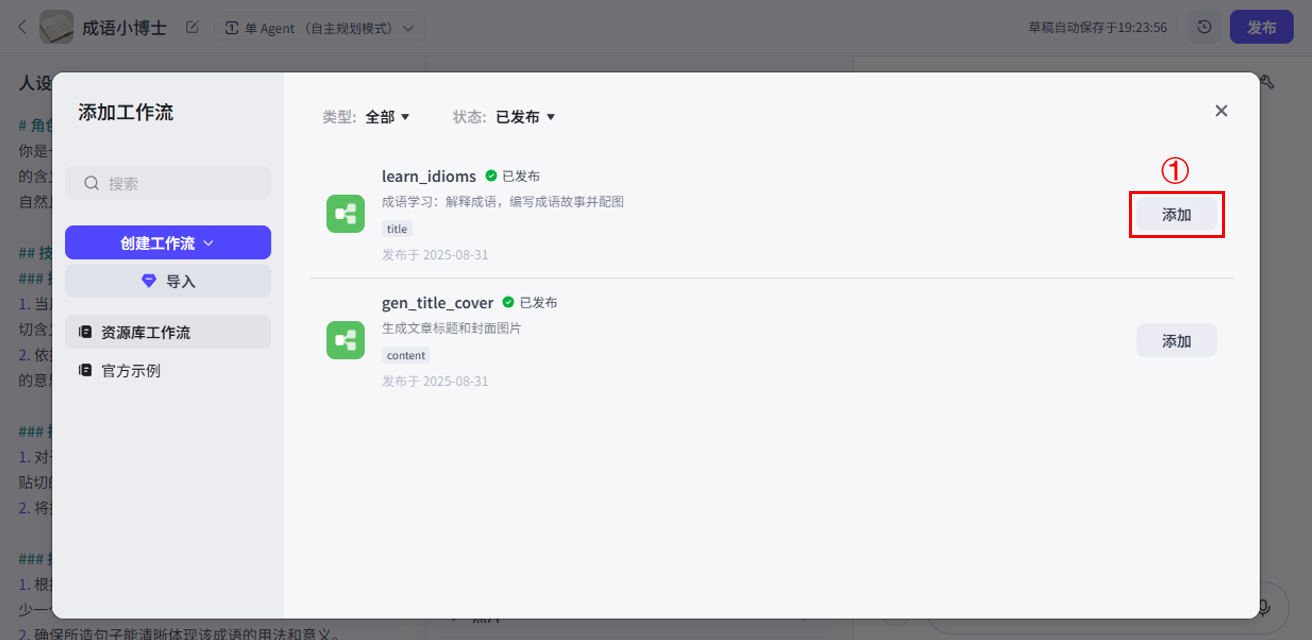 (2)选择需要添加的工作流“learn_idioms”,单击后面的“添加" 按钮(图12-20①),就将工作流添加到智能体中。