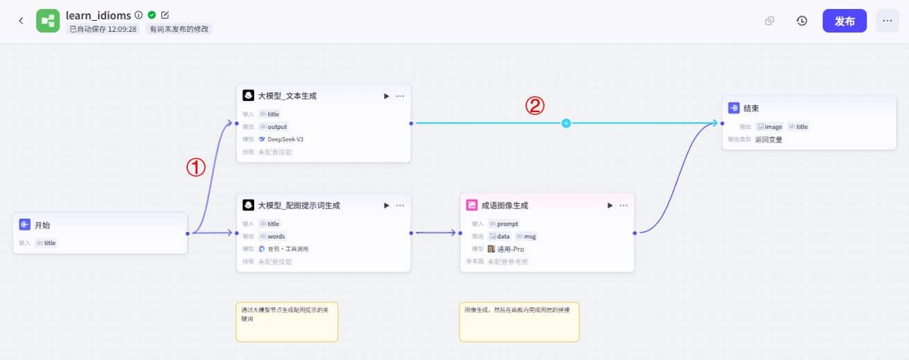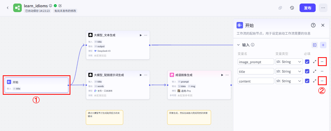 (2)模板中的初始节点包括3个变量,本例只要使用变量title用于输入成语。点击变量image_prompt、content之后的“-”按钮(图12-16②),删除这两个变量。