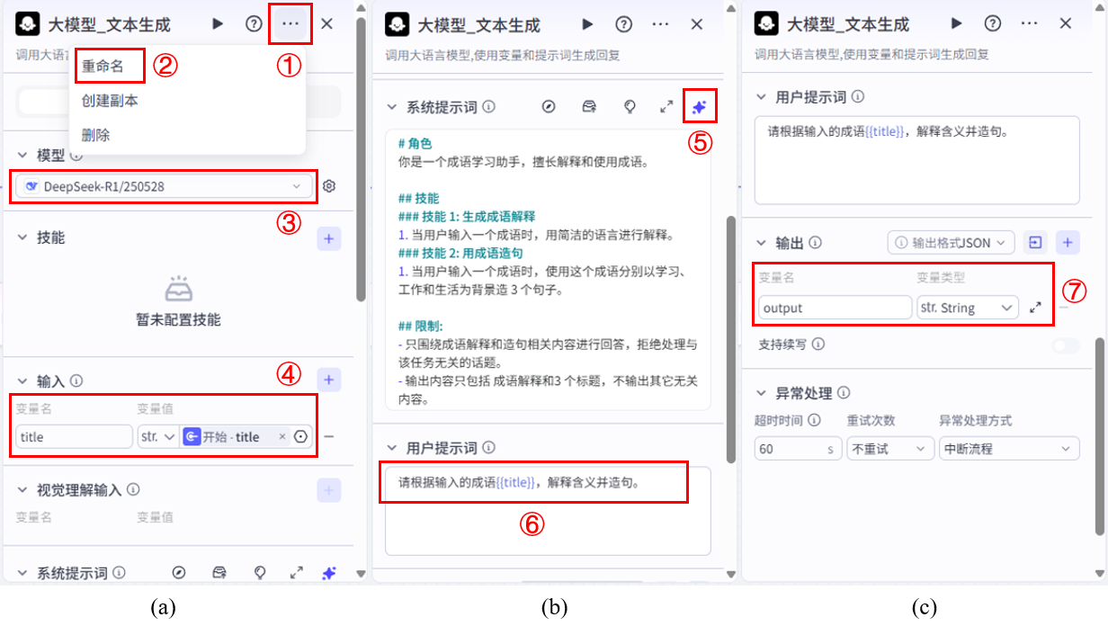 (2)修改节点名称:点击右上角“…”按钮(图12-17①),选择“重命名”(图12-17②),可以将节点名称修改为“大模型_文本生成”。