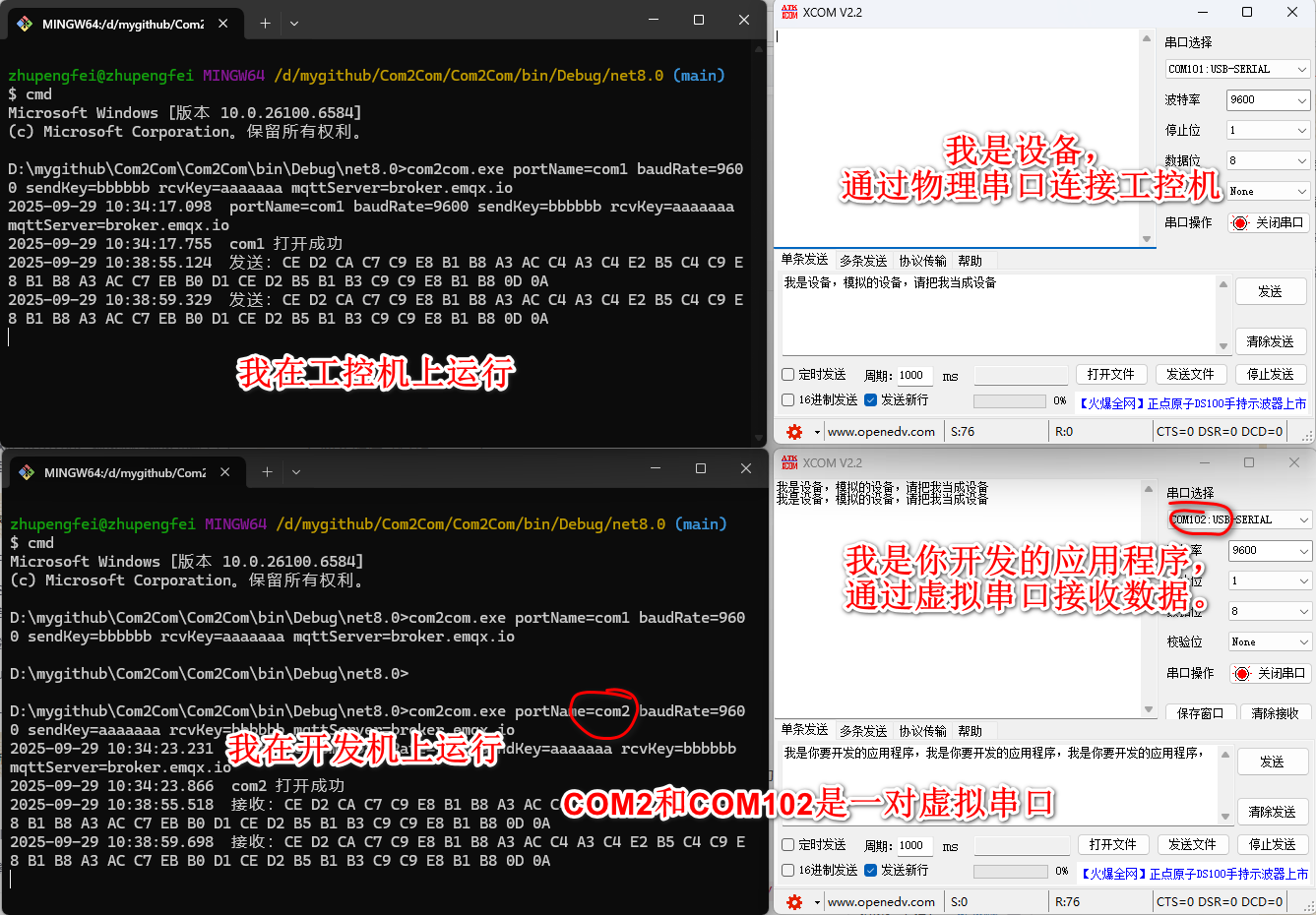下图中的两个串口调试工具,仅为演示效果使用,实际场景中一个是你的设备,另一个是你的应用程序。