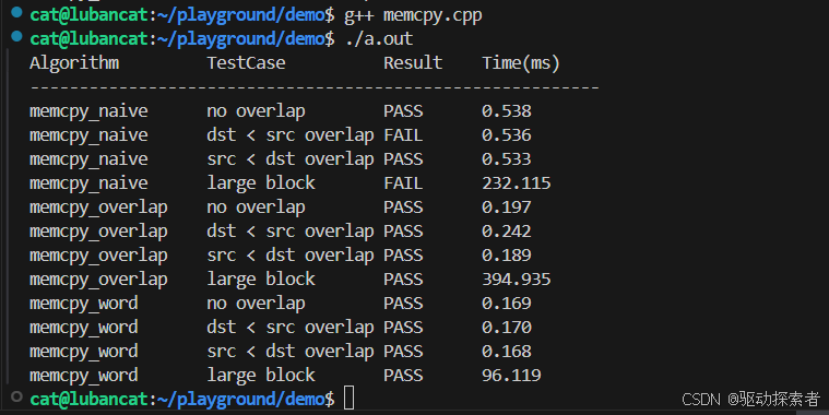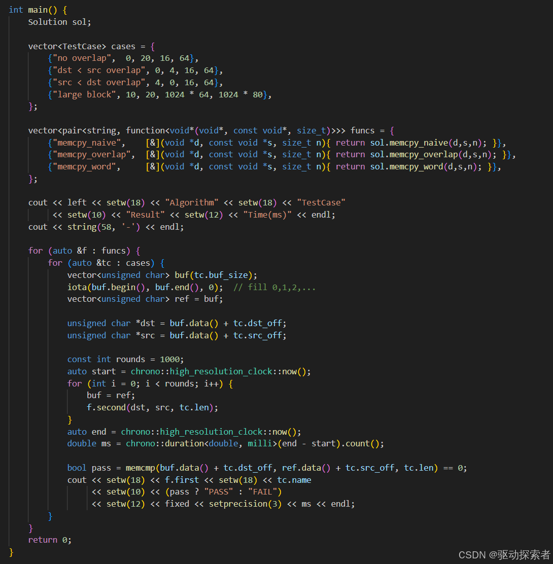 };int main() {Solution sol;vector<TestCase> cases = {{"no overlap", 0, 20, 16, 64},{"dst < src overlap", 0, 4, 16, 64},{"src < dst overlap", 4, 0, 16, 64},{"large block", 10, 20, 1024 * 64, 1024 * 80},};vector<pair<string, function<void*(void*, const void*, size_t)>>> funcs = {{"memcpy_naive", [&](void *d, const void *s, size_t n){ return sol.memcpy_naive(d,s,n); }},{"memcpy_overlap", [&](void *d, const void *s, size_t n){ return sol.memcpy_overlap(d,s,n); }},{"memcpy_word", [&](void *d, const void *s, size_t n){ return sol.memcpy_word(d,s,n); }},};cout << left << setw(18) << "Algorithm" << setw(18) << "TestCase"<< setw(10) << "Result" << setw(12) << "Time(ms)" << endl;cout << string(58, '-') << endl;for (auto &f : funcs) {for (auto &tc : cases) {vector<unsigned char> buf(tc.buf_size);iota(buf.begin(), buf.end(), 0); // fill 0,1,2,...vector<unsigned char> ref = buf;unsigned char *dst = buf.data() + tc.dst_off;unsigned char *src = buf.data() + tc.src_off;const int rounds = 1000;auto start = chrono::high_resolution_clock::now();for (int i = 0; i < rounds; i++) {buf = ref;f.second(dst, src, tc.len);}auto end = chrono::high_resolution_clock::now();double ms = chrono::duration<double, milli>(end - start).count();bool pass = memcmp(buf.data() + tc.dst_off, ref.data() + tc.src_off, tc.len) == 0;cout << setw(18) << f.first << setw(18) << tc.name<< setw(10) << (pass ? "PASS" : "FAIL")<< setw(12) << fixed << setprecision(3) << ms << endl;}}return 0;