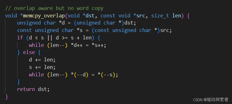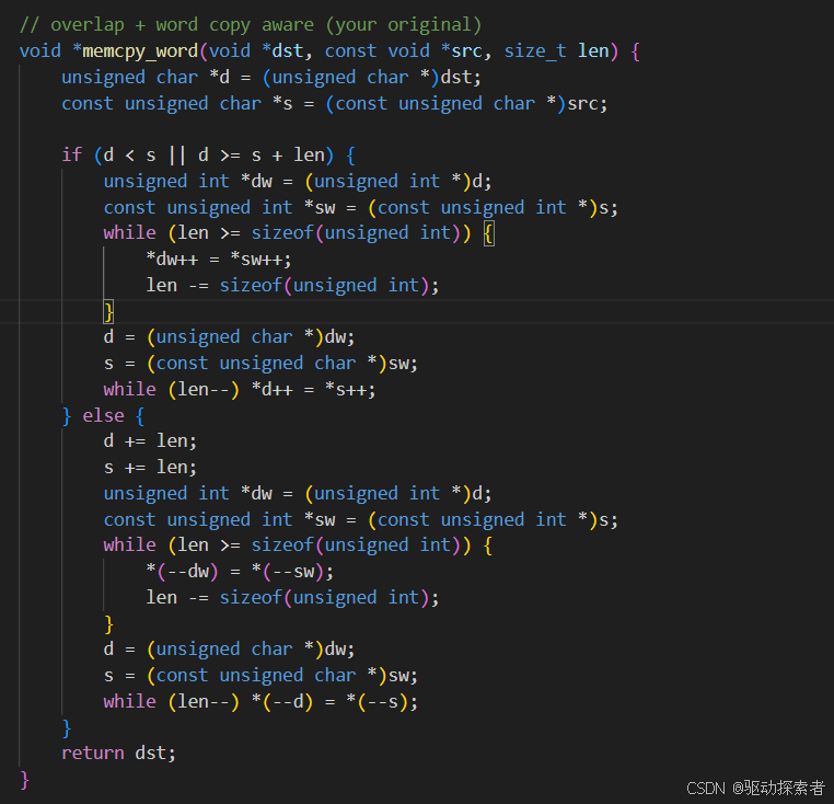 public:// naive: no overlap, no word copyvoid *memcpy_naive(void *dst, const void *src, size_t len) {unsigned char *d = (unsigned char *)dst;const unsigned char *s = (const unsigned char *)src;while (len--) *d++ = *s++;return dst;}// overlap aware but no word copyvoid *memcpy_overlap(void *dst, const void *src, size_t len) {unsigned char *d = (unsigned char *)dst;const unsigned char *s = (const unsigned char *)src;if (d < s || d >= s + len) {while (len--) *d++ = *s++;} else {d += len;s += len;while (len--) *(--d) = *(--s);}return dst;}// overlap + word copy aware (your original)void *memcpy_word(void *dst, const void *src, size_t len) {unsigned char *d = (unsigned char *)dst;const unsigned char *s = (const unsigned char *)src;if (d < s || d >= s + len) {unsigned int *dw = (unsigned int *)d;const unsigned int *sw = (const unsigned int *)s;while (len >= sizeof(unsigned int)) {*dw++ = *sw++;len -= sizeof(unsigned int);}d = (unsigned char *)dw;s = (const unsigned char *)sw;while (len--) *d++ = *s++;} else {d += len;s += len;unsigned int *dw = (unsigned int *)d;const unsigned int *sw = (const unsigned int *)s;while (len >= sizeof(unsigned int)) {*(--dw) = *(--sw);len -= sizeof(unsigned int);}d = (unsigned char *)dw;s = (const unsigned char *)sw;while (len--) *(--d) = *(--s);}return dst;}