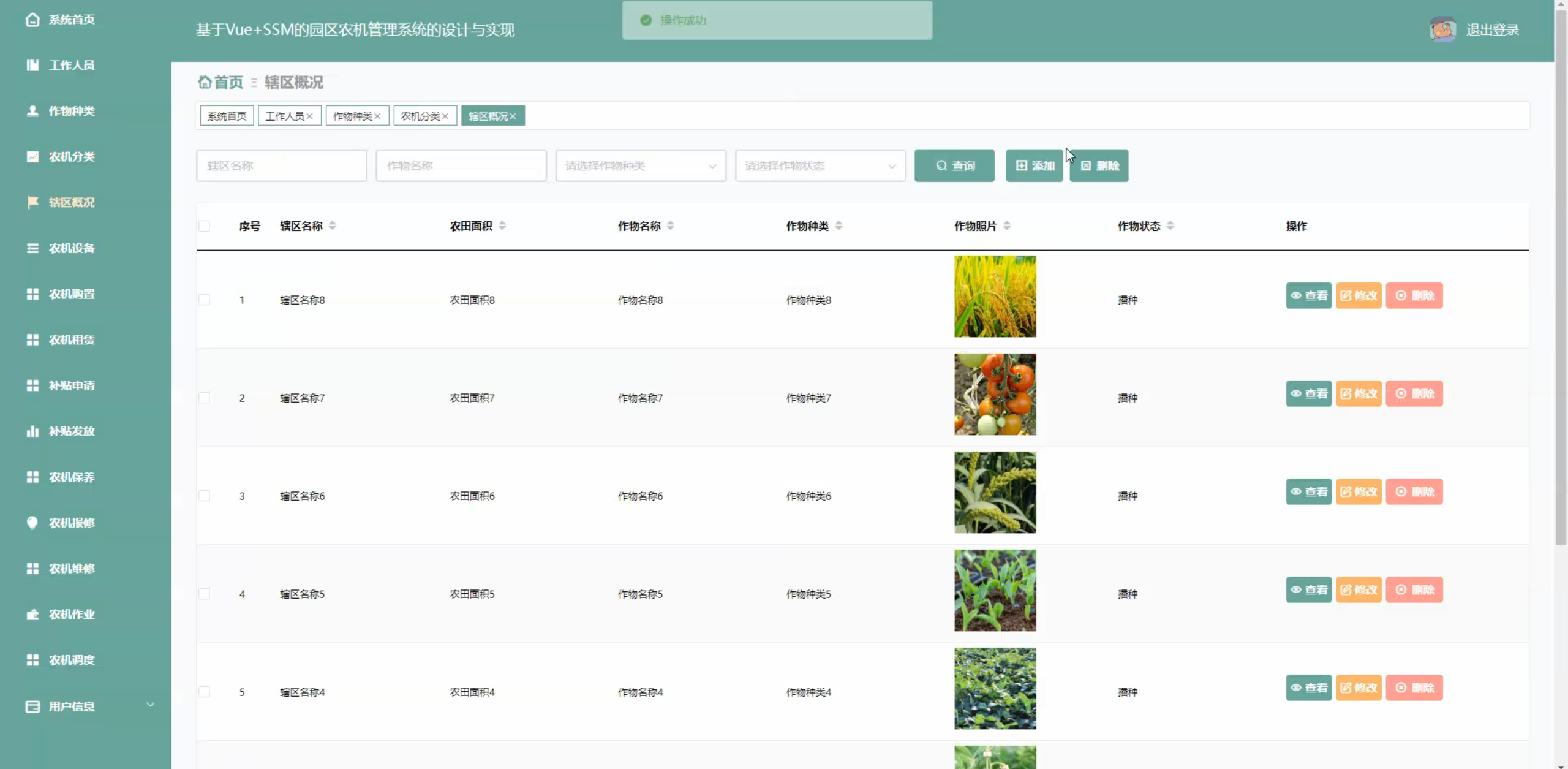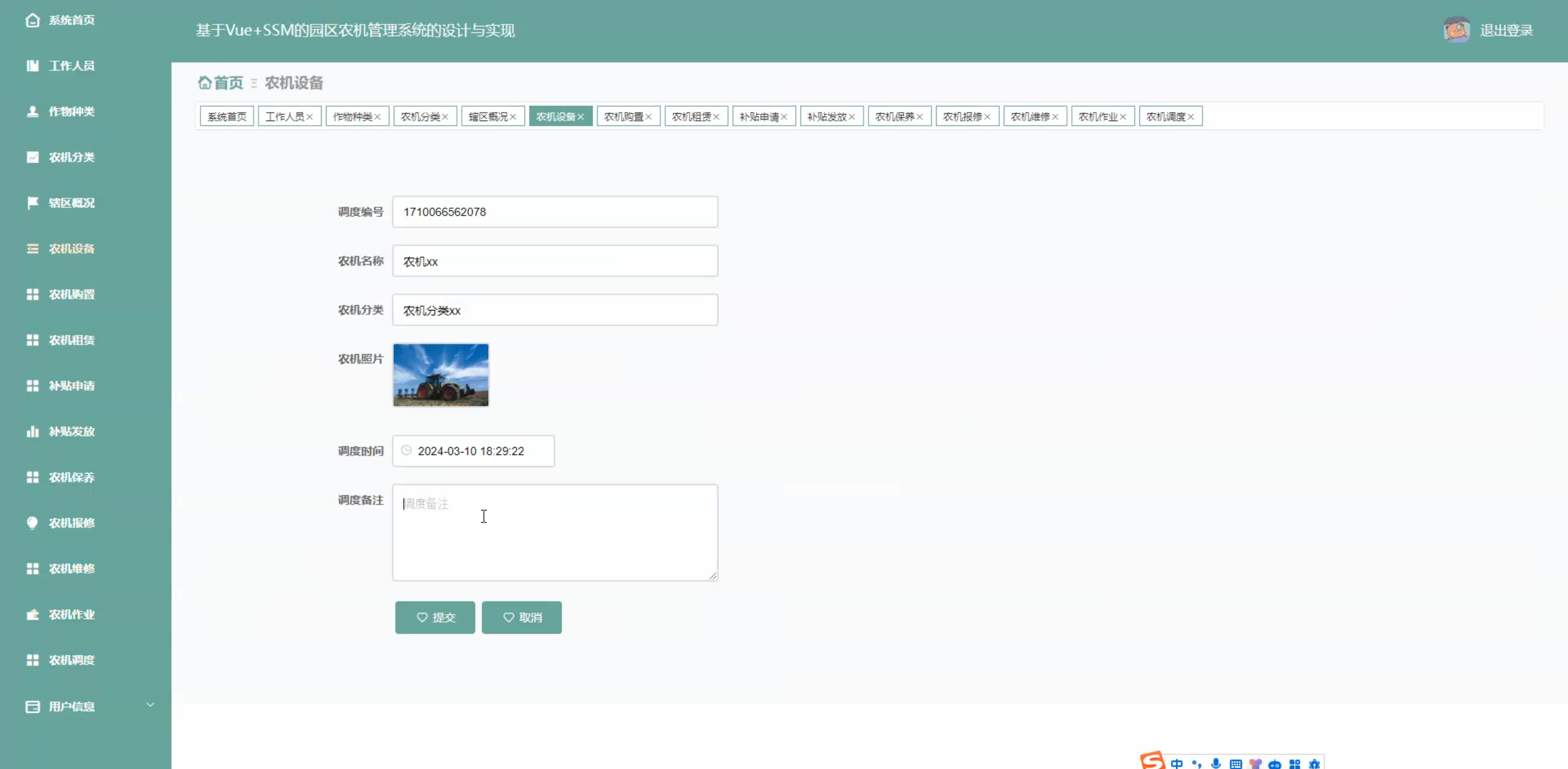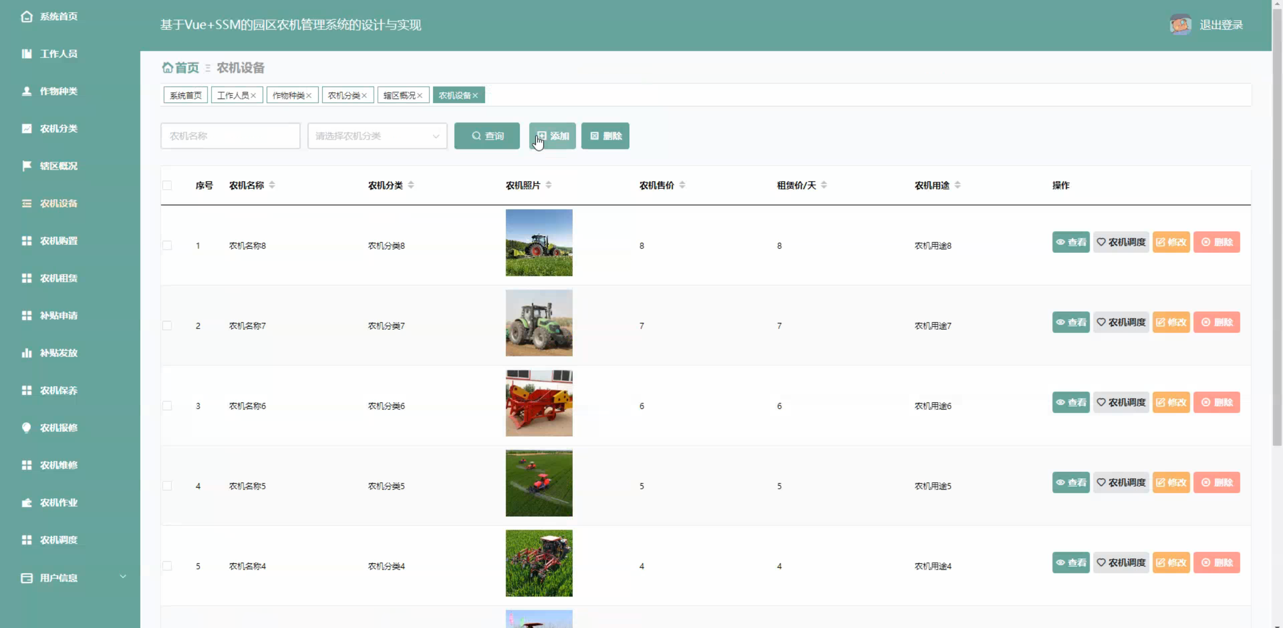 本系统通过Vue框架构建信息化管理平台,可实现设备全生命周期管理、智能调度、安全预警等功能,解决信息孤岛问题。研究显示,采用信息化管理系统的园区设备利用率提升30%,维修成本降低25%,安全事故率下降40%。本研究对推动农业数字化转型、实现“双一流”建设目标具有重要价值。