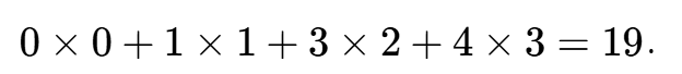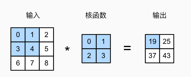 # Y[0,0] = X[0:2, 0:2] * K 的和 = [[0.,1.],[3.,4.]] * [[0.,1.],[2.,3.]] = (0 * 0 + 1 * 1 + 3 * 2 + 4 * 3) = 0+1+6+12 = 19.0