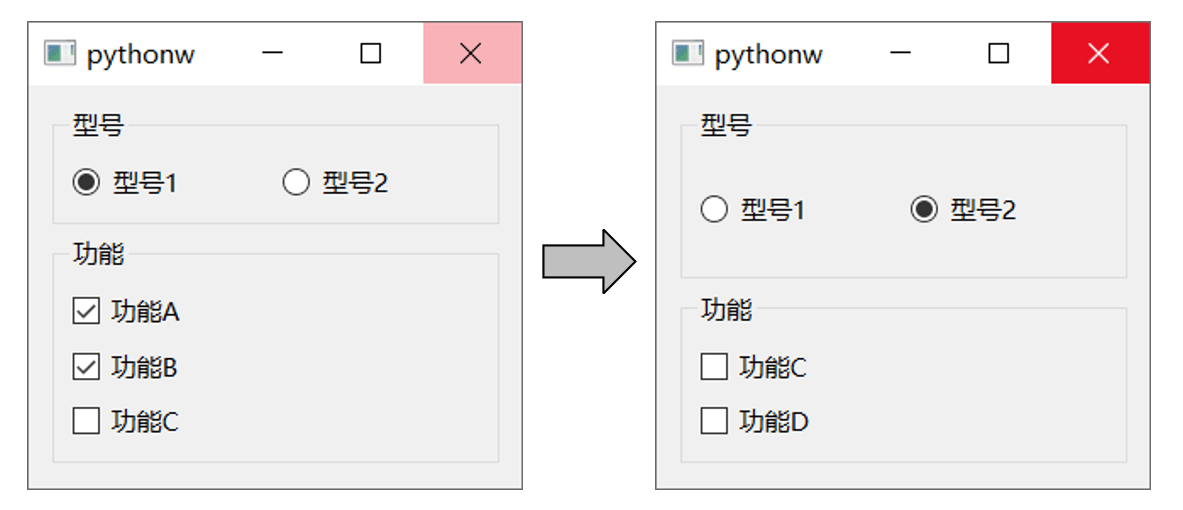def __init__(self):super().__init__()self.model_funcs = {"型号1" : ["功能A", "功能B", "功能C"],"型号2" : ["功能C", "功能D"]}self.model_radio_button = {}self.func_checkboxes = {}self.init_ui()
