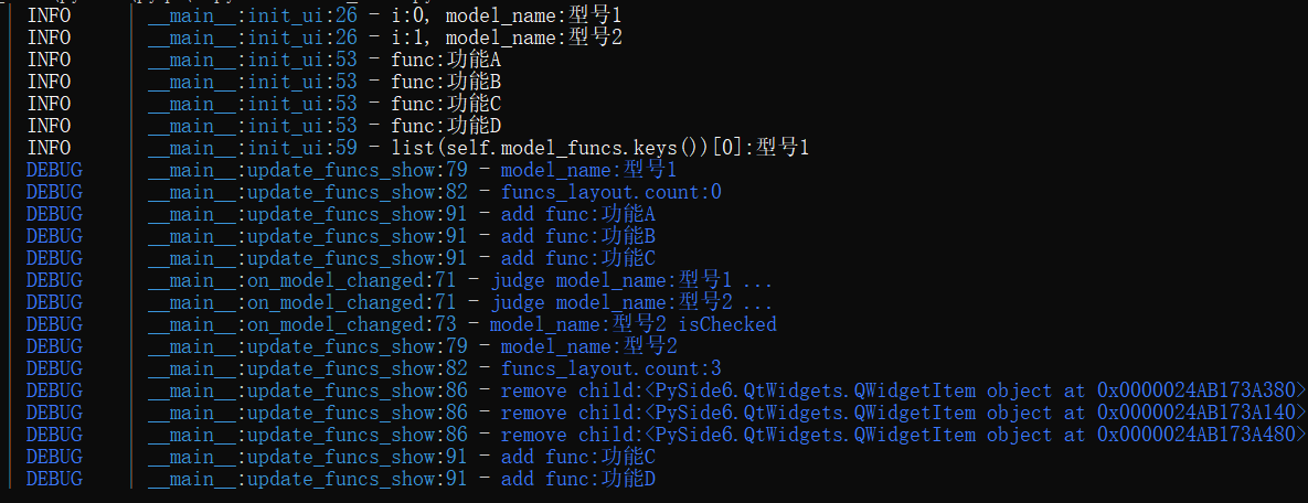 # 根据型号和更新显示对应的功能def update_funcs_show(self, model_name):logger.debug(f"model_name:{model_name}")# 先清除logger.debug(f"funcs_layout.count:{self.funcs_layout.count()}")while self.funcs_layout.count():child = self.funcs_layout.takeAt(0)if child.widget():logger.debug(f"remove child:{child}")child.widget().setParent(None)# 再添加for func in self.model_funcs[model_name]:logger.debug(f"add func:{func}")# 将checkbox组件添加到布局self.funcs_layout.addWidget(self.func_checkboxes[func])